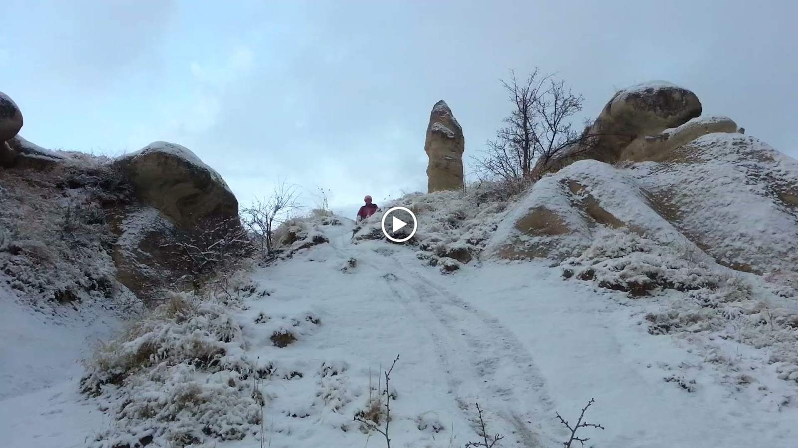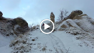 昨天下午下了一场大雪,晚上又断断续续地飘了一些雪,今天早上这里一片白茫茫,非常好看!走着走着,老公就提议,不如多留一天,在这里欣赏雪景,玩玩雪。好啊!我当然赞成啦!今天早上走过的山谷中,有一支支圆圆的石柱,但这些石柱基本上比爱情谷的矮,而且柱顶是圆柱三角体,看上去就像是一把把天兵天将不小心掉到地面上的剑,我想这里大概就是sword valley吧?其实我也不敢肯定。但是,只要是美景,管他什么名堂,对不?这里除了这些独特的石柱,还被我发现到一间很大很精致的教堂,和那天在玫瑰谷看到的山洞教堂一样,其貌不扬,但里面可是宏伟庄严,教堂内的柱子都是开凿出来的,不同的是玫瑰谷的山洞教堂的柱子是圆形的,这里的是方形的,而且柱子上的刻纹图案仍然清晰可见,让人甚感赞叹!此外,附近还有一根石柱的底部有一小片的刻纹图案,觉得挺特别的。走在雪地上的感觉很特别,雪有一、两寸厚,踏上去软绵绵的。白雪把大地覆盖起来,我们走在山谷中,其实也看不出哪里才是“路”,只能随便乱走,有时要下斜坡,比较陡的,干脆用“滑”的,“啊~~!!”的就滑下去了,好刺激好好玩哦!!!有了第一次后,我们就好想有第二次,但也不能看到斜坡就滑,有的斜坡不陡,不容易滑,还要评估这个斜坡下面有没有潜伏的危险。除了好玩的斜坡,有时我们也爬到山谷中比较高的地方,可以眺望四周美丽的雪景。美丽的景色不嫌多,也不会腻,我们过后又跑到“sunset point”去俯瞰周围景色。这时烈日当空,很多雪已经融化了,部分地区不再白皑皑一片,但是没有被太阳照射到的山谷仍然非常漂亮。